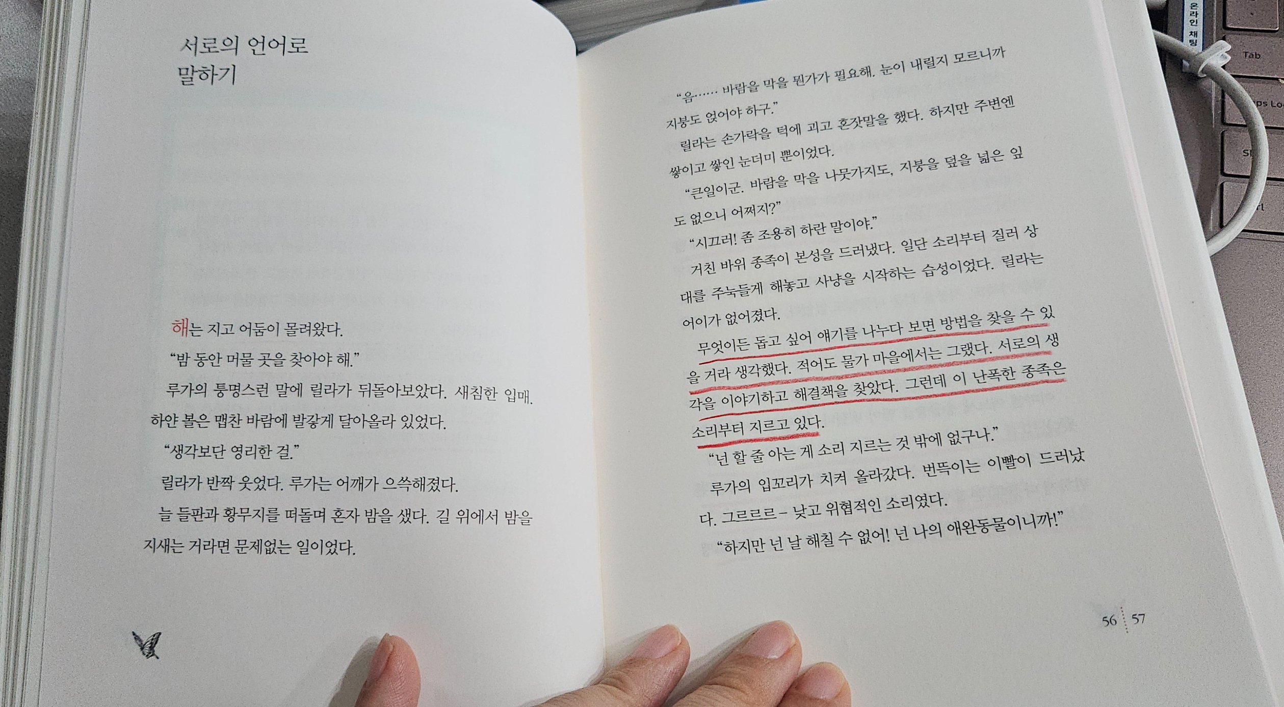 무엇이든 돕고 싶어 얘기를 나누다 보면 방법을 찾을 수 있을 거라 생각했다. 적어도 물가 마을에서는 그랬다. 서로의 생각을 이야기하고 해결책을 찾아다. 그런데 이 난폭한 종족은 소리부터 지르고 있다.