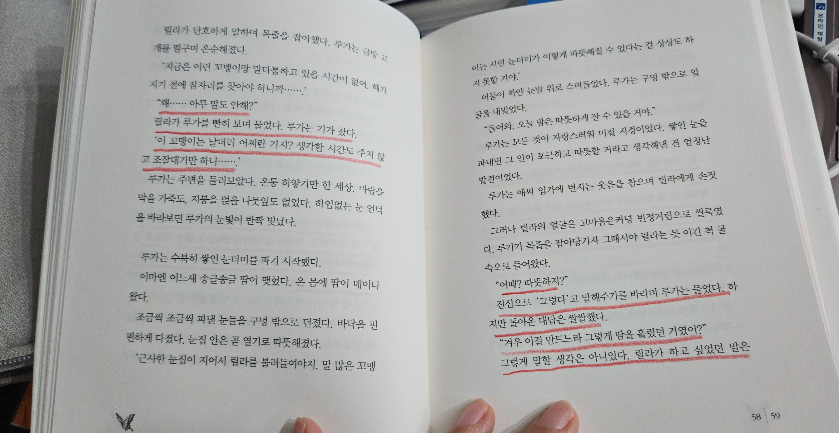 그렇게 말할 생각은 아니었다. 릴라가 하고 싶었던 말은 '정말 따듯해. 어떠헥 이런 생각을 다했지?'였다. 하지만 혼자 모든 일을 알아서 끝내버린 루가가 미워진 것이다.