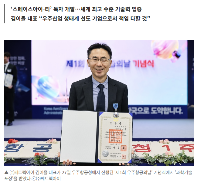 쎄트렉아이 대표이사김이을 ㈜쎄트렉아이 대표이사가 지난 27일 우주항공청 주최로 열린 ‘제1회 우주항공의 날’ 기념식에서 국가 우주산업 발전에 기여한 공로를 인정받아 ‘과학기술 포장’을 수상했다.