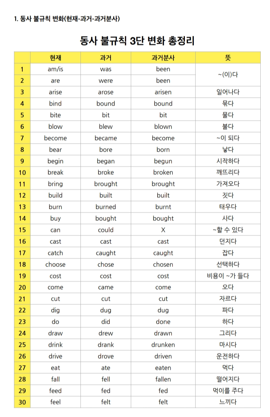 초등고학년, 중등이 활용하기 좋은 불규칙동사 3단 변화표입니다.