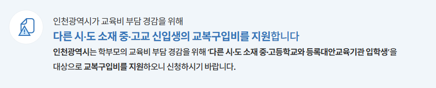 자녀가 다른 시·도의 중·고등학교에 입학하는데 교복비가 부담되시나요? 인천광역시가 학부모님의 경제적 부담을 덜어드리기 위해 교복구입비를 지원합니다!