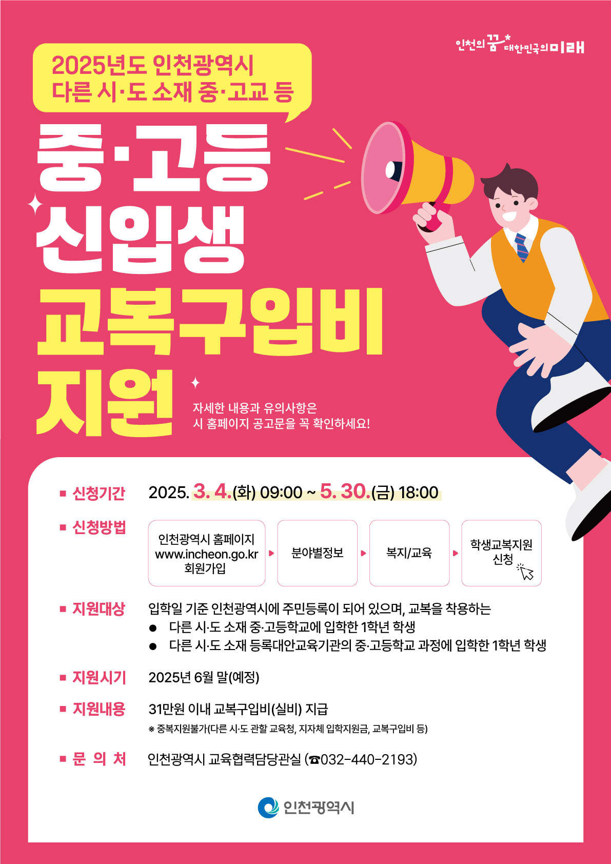자녀가 다른 시·도의 중·고등학교에 입학하는데 교복비가 부담되시나요? 인천광역시가 학부모님의 경제적 부담을 덜어드리기 위해 교복구입비를 지원합니다!