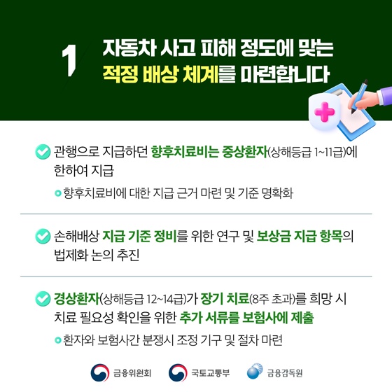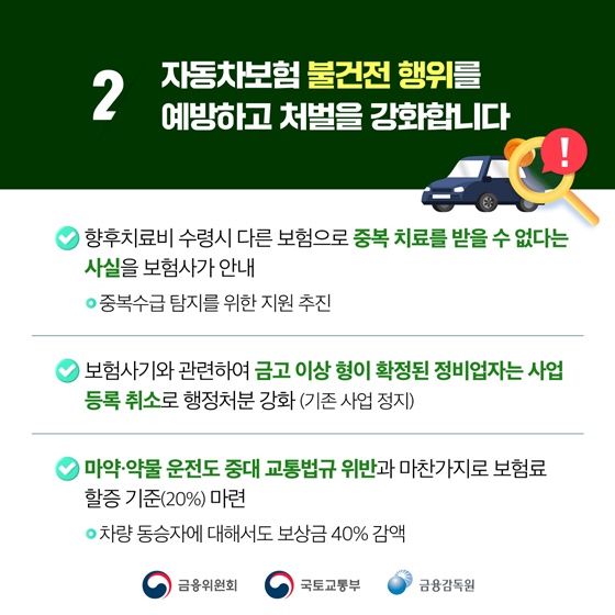 결국, 경미한 사고로 과도한 합의금을 요구하거나 불필요한 장기 치료를 유도하는 자동차보험 부정수급을 막겠다는 것! 🚦