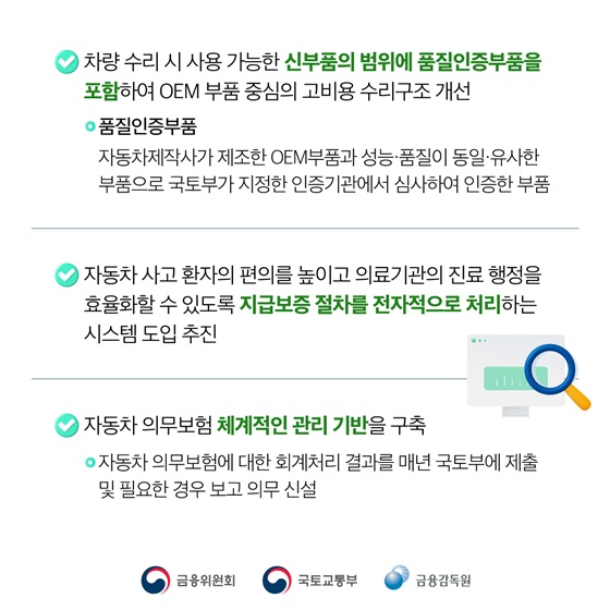 👉 차량 수리 시 선택할 수 있는 부품의 범위를 품질인증부품*까지 확대합니다. 기존에는 자동차 제조사가 만든 *OEM 부품 위주라서 수리비가 비쌌는데, 이제는 동일한 성능과 품질을 가진 부품을 선택할 수 있어요! 🛠️
