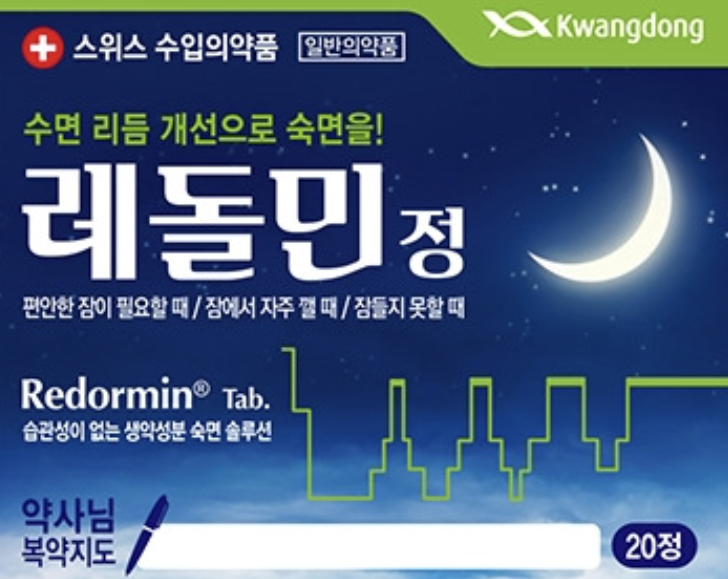 레돌민은 빠른 수면 유도 효과로 알려져 있으며, 특히 일시적인 불면증에 효과적입니다. 불안정한 수면리듬 조절제입니다. 직접적 수면유도제는 아니구요. 시차적응, 교대근무 수면 리듬 회복에 효과가 있습니다.