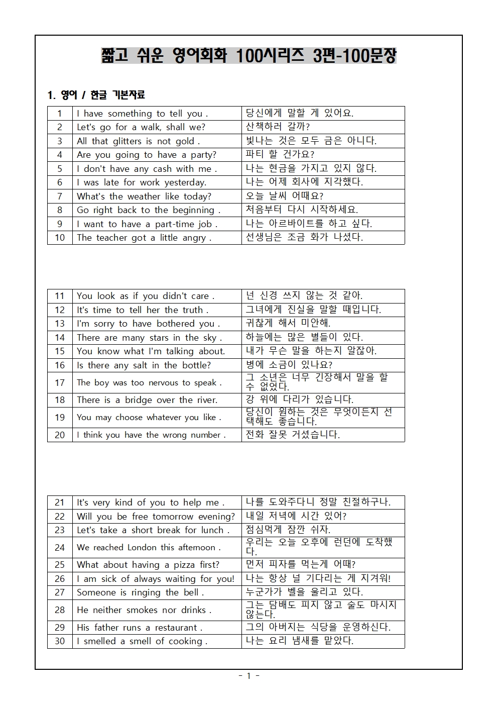 짧고 쉬운 영어회화 100시리즈 1편-100문장 - 자료 공유