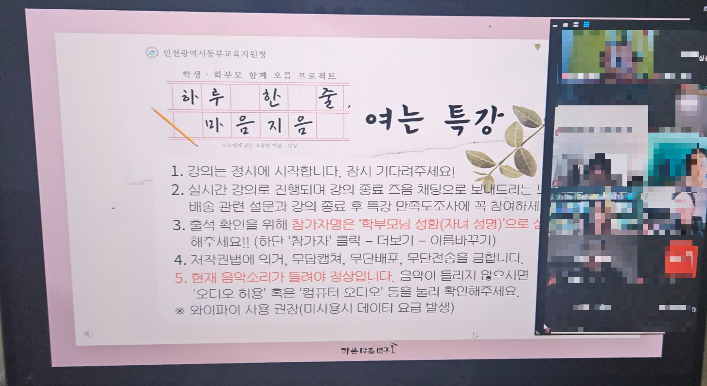 인천 동부교육 지원청 하루한줄 마음 지음 -여는특강이 zoom으로 있었다.