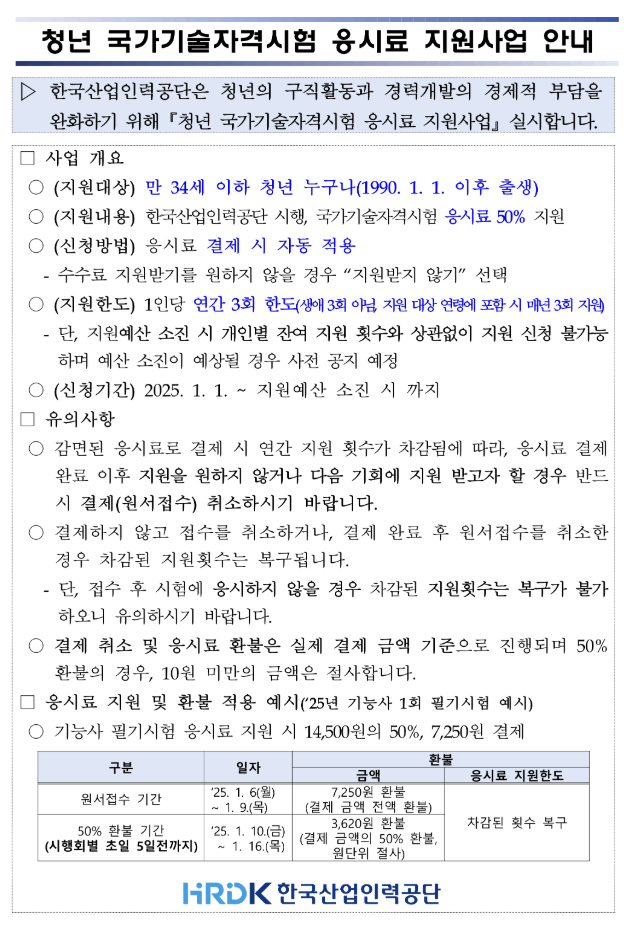 - 지원 범위: 국가기술자격시험 응시료 50%